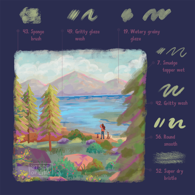 These are my favorite Procreate brushes to paint and create a gouache look and feel when drawing stylized characters and environments.